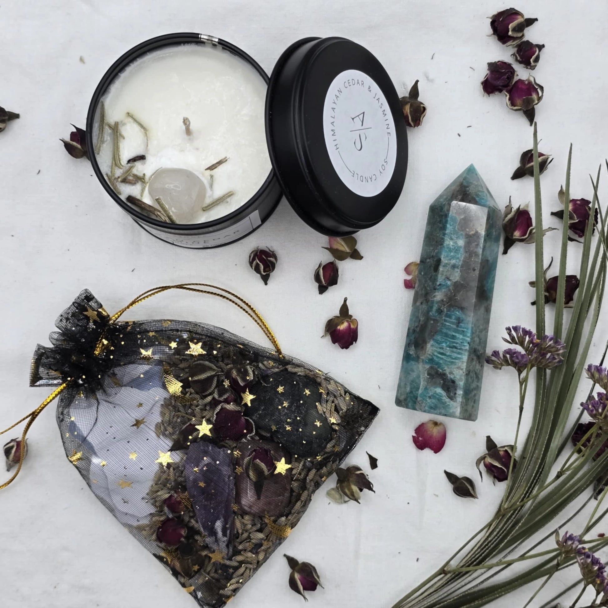 Vsaka škatlica vsebuje naravna suha zelišča, ki dopolnjujejo energijo kristalov in prostora.