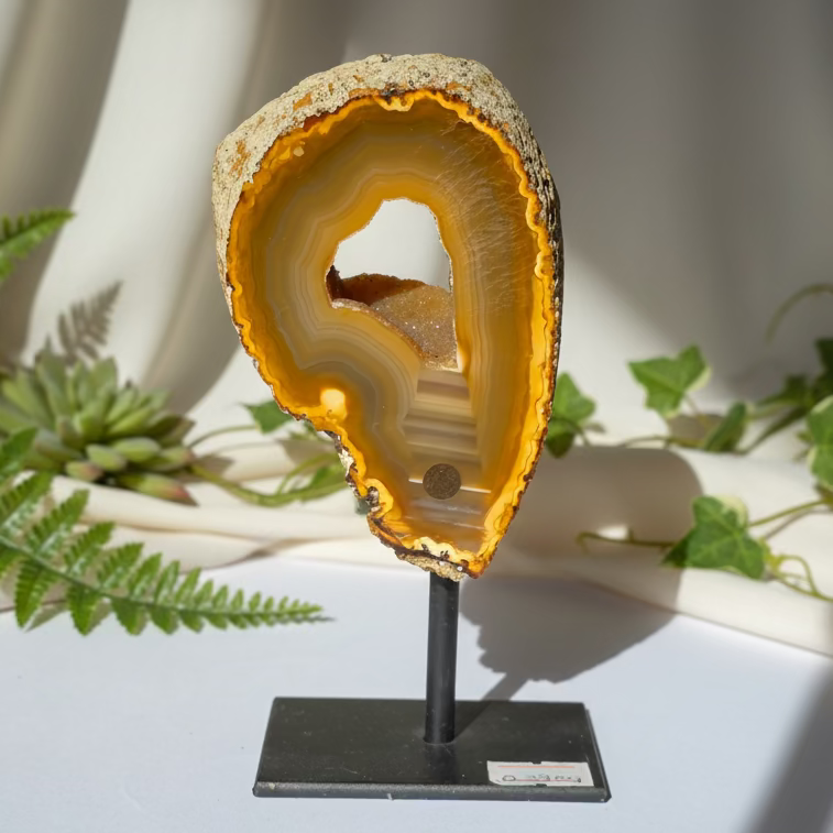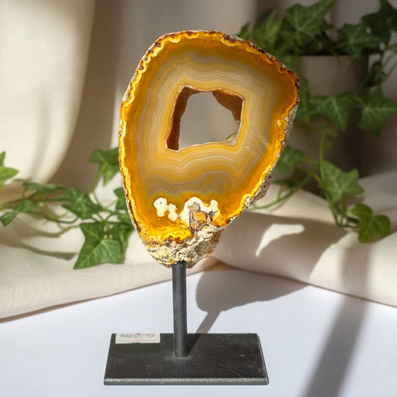 Ahat na stojalu je elegantna in stabilna dekoracija za dom, pisarno ali poslovni prostor. Kombinacija naravnega kamna in kovinskega stojala poudari lepoto kristalne strukture ter omogoča, da druzi ahat zasije v vsej svoji naravni energiji. Zaradi svojega estetskega videza je priljubljen kot luksuzna kristalna dekoracija ali posebno darilo.