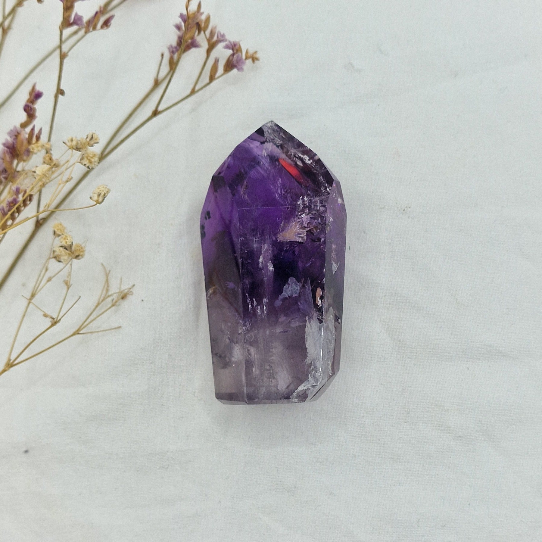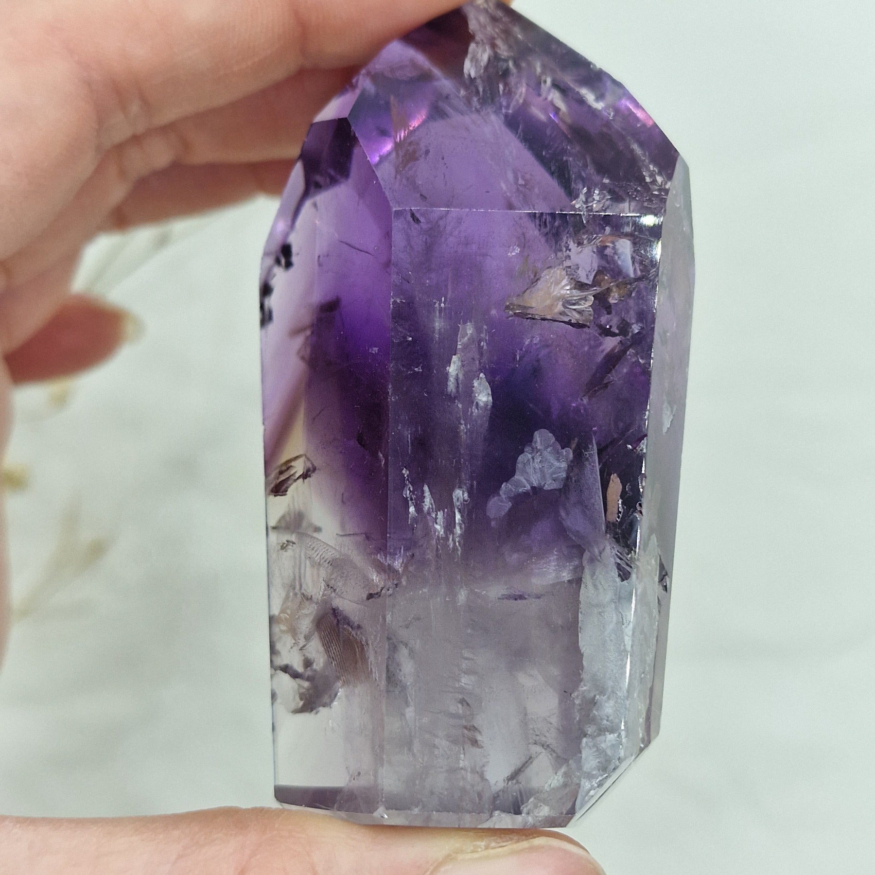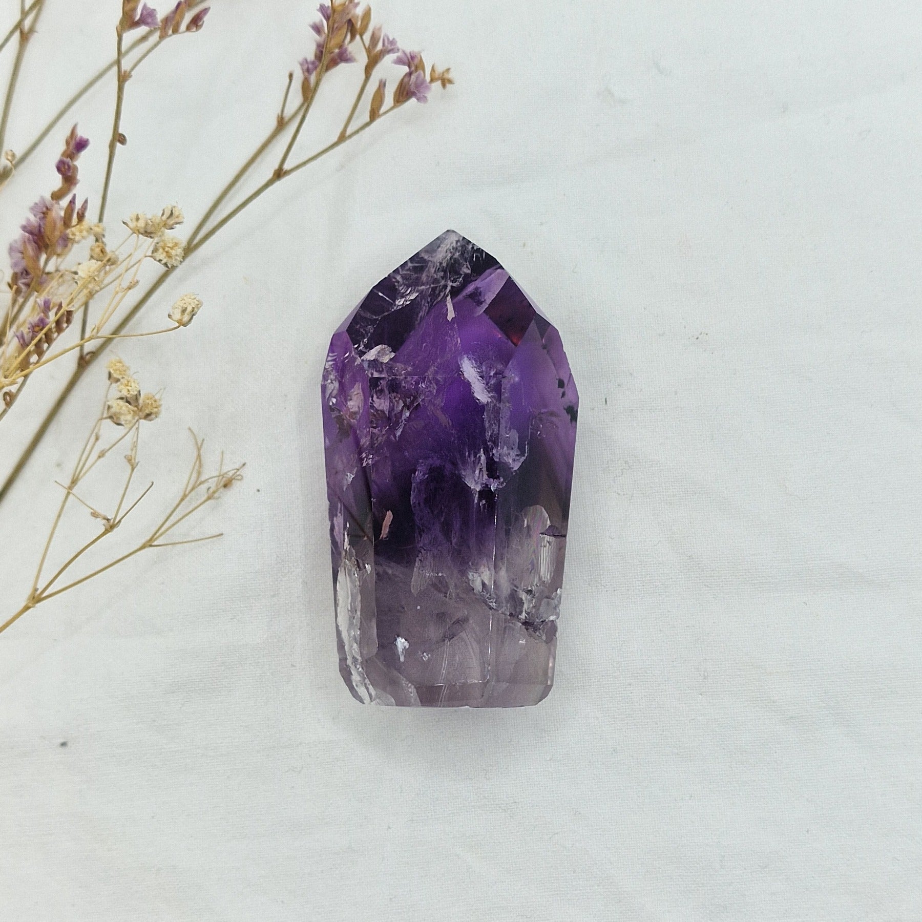 Fantom ametrin z izrazitim fantomom, sestavljen iz kamene strele in ametrina, je izjemno redek in vizualno osupljiv kristal. Ta unikatni kristal združuje prosojne plasti kamene strele z bogatimi odtenki ametista in citrina, kar ustvarja edinstven fantomski učinek. Izraziti fantomi v tem kristalu ne le dodajajo vizualno globino, ampak tudi simbolizirajo zgodovino in zapletenost rasti kristala.