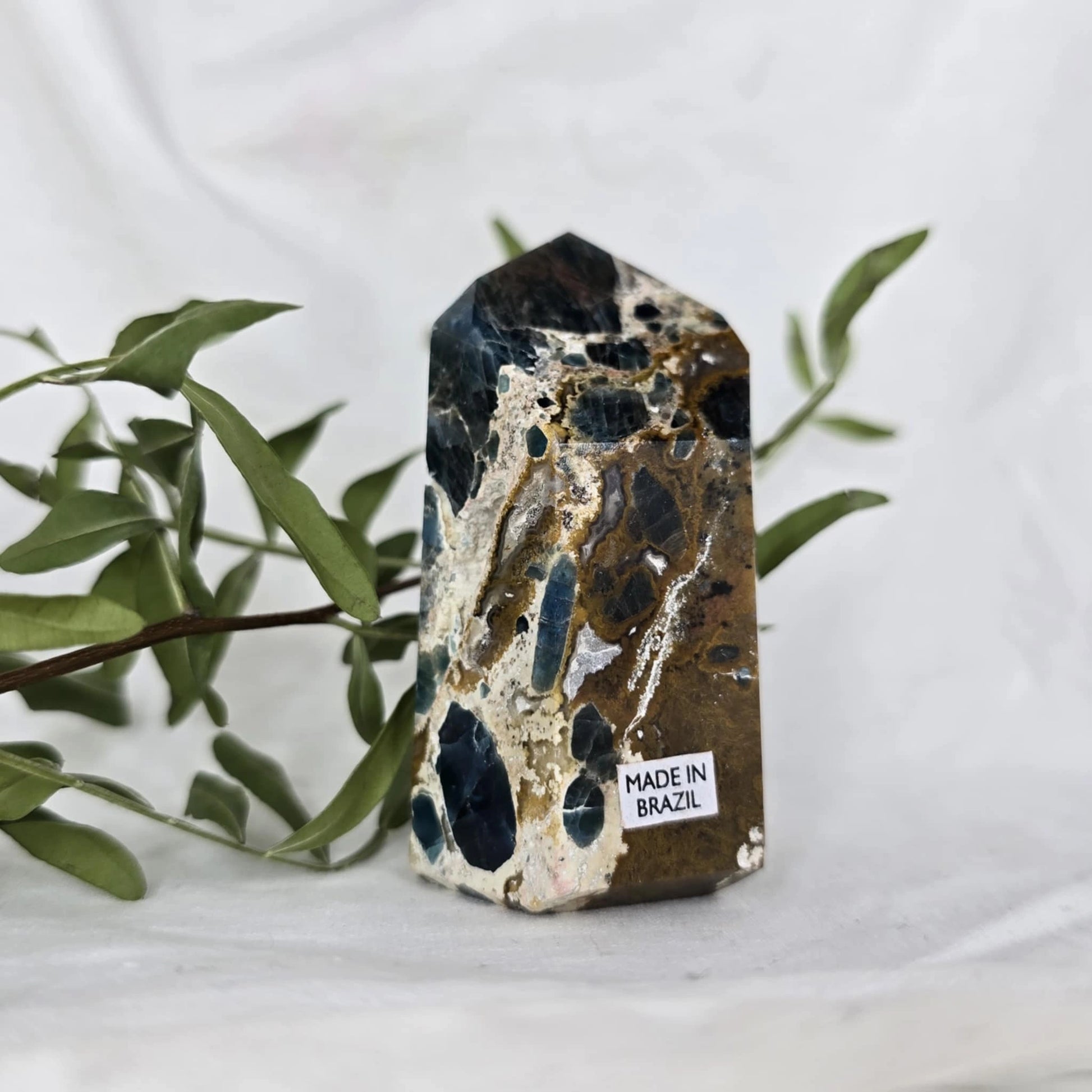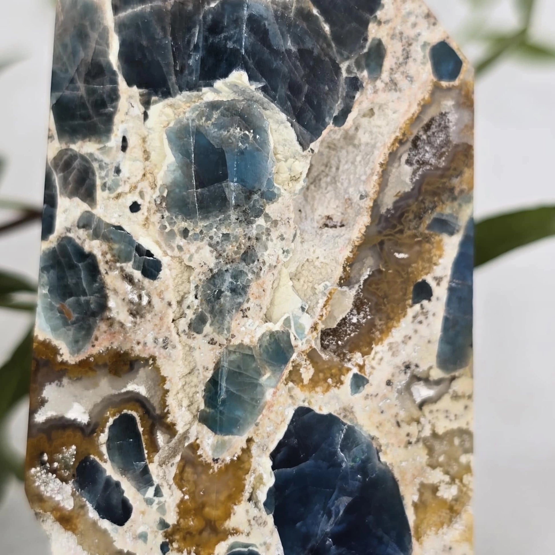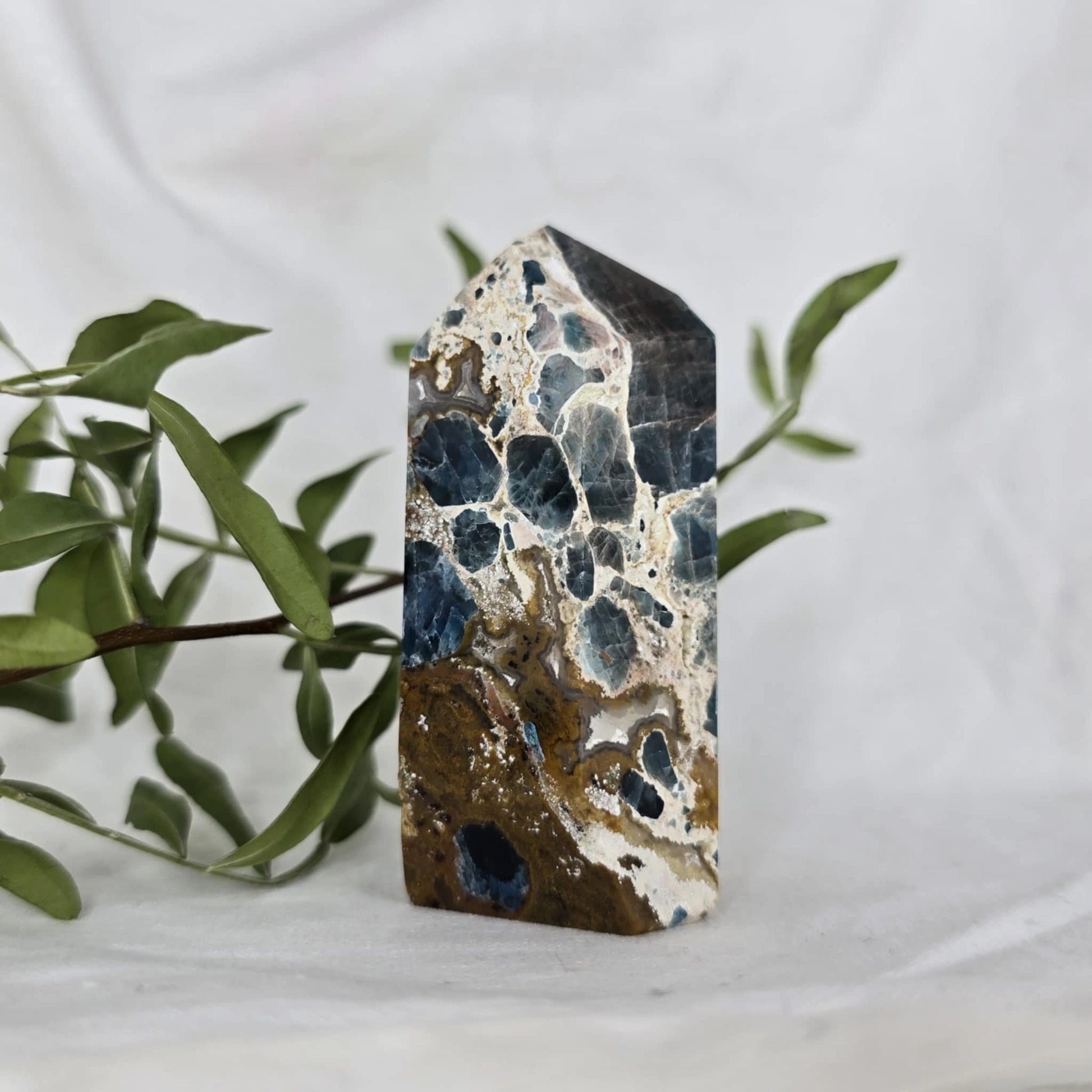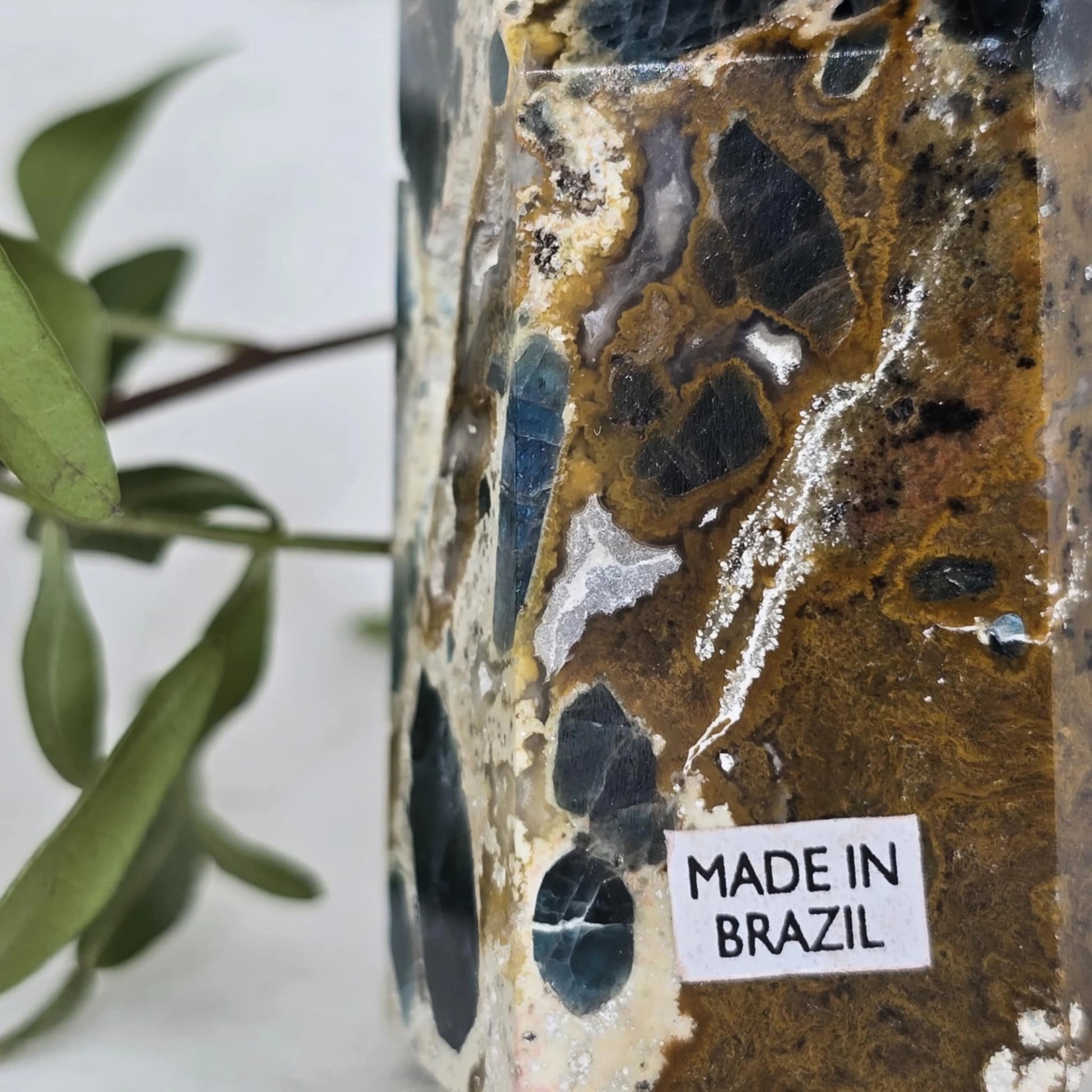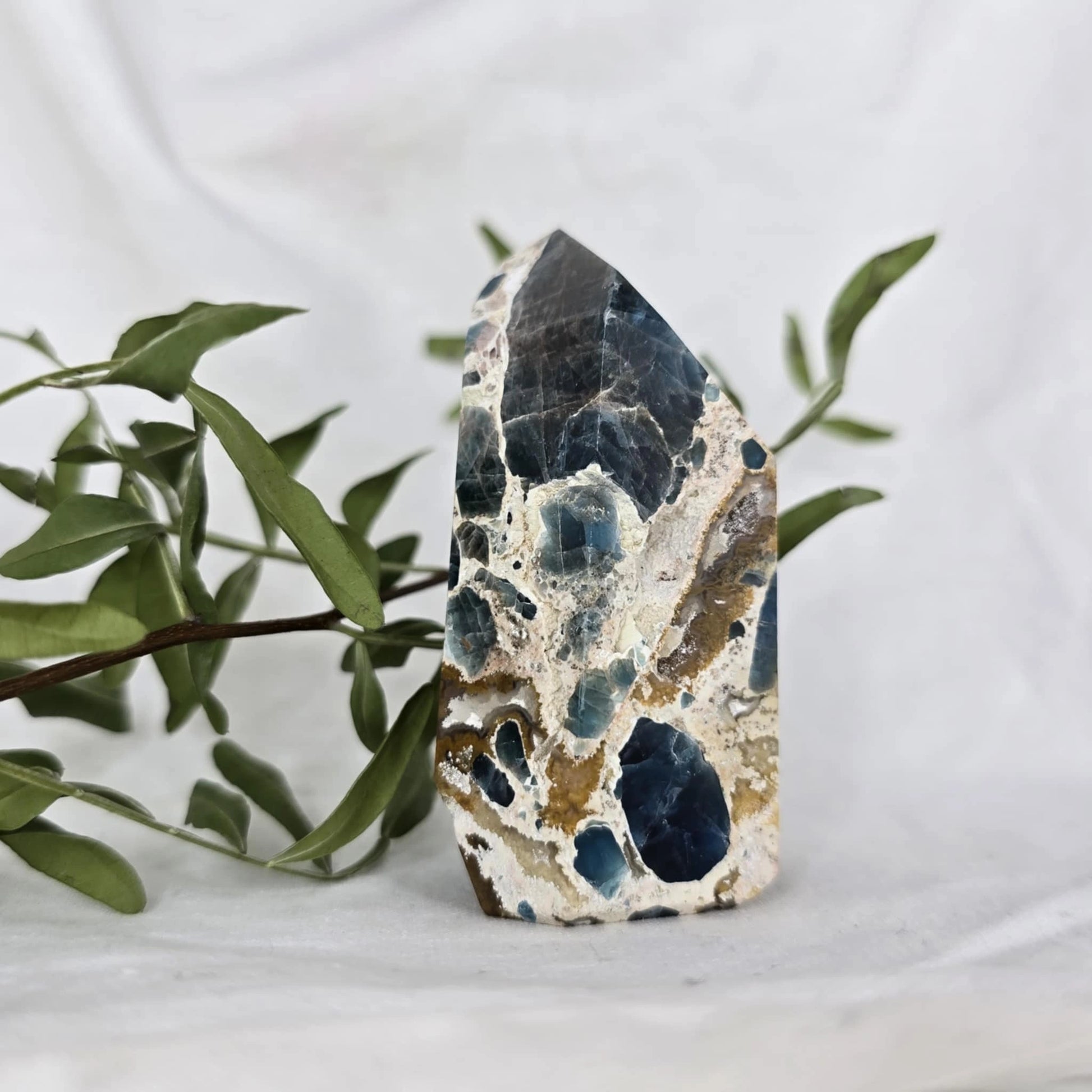 Ta primerek apatita je še posebej edinstven, saj vsebuje tudi naravne vključke kalcedona. Ti vključki dodajajo dodatno dimenzijo kristalu, ki še povečuje njegovo lepoto in energetsko moč, hkrati pa dajejo vsakemu kosu poseben značaj in globino.