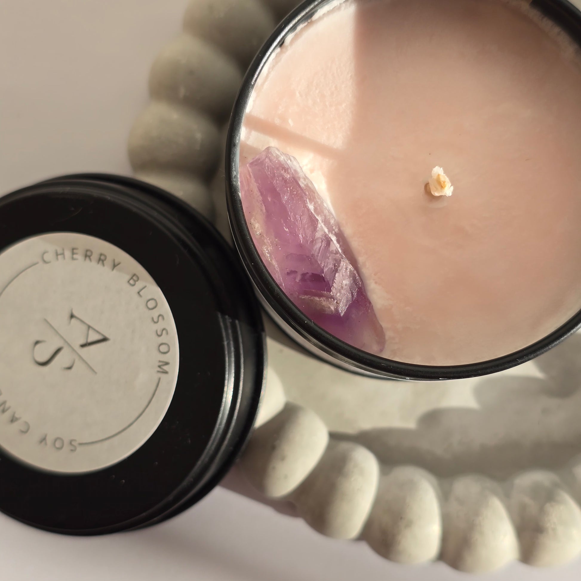 Prepustite se nežni, romantični energiji cvetoče pomladi. Naša ročno izdelana sojina sveča združuje prefinjen cvetlični vonj češnjevih cvetov (Cherry Blossom) ter energijsko moč kristala, ki se skriva v njeni notranjosti. Ustvarjena je v Sloveniji z ljubeznijo do naravnih materialov, detajlov in harmonične atmosfere.