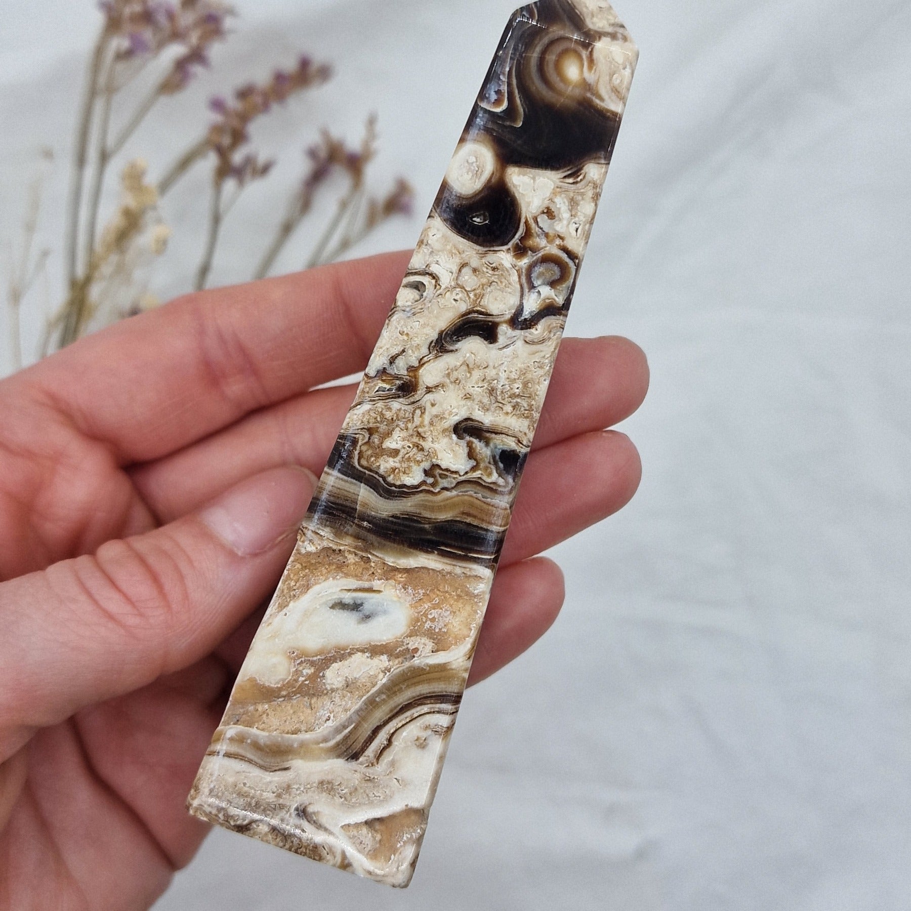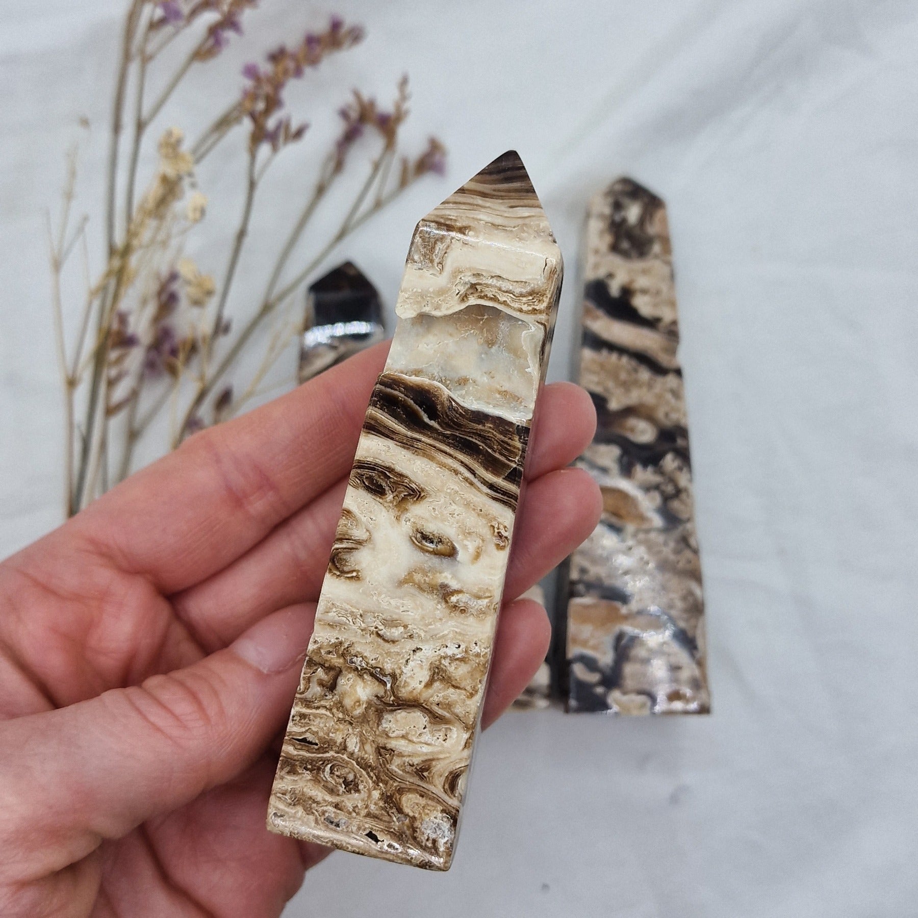 Čokoladni kalcit je čudovit kamen s kombinacijo temno rjavih pasov in bledo rjavih pasov nugat barve, včasih imenovan rjavi aragonit. Kalcit in aragonit sta v bistvu kalcijev karbonat, vendar se aragonit tvori, ko je izpostavljen večjim količinam toplote in tlaka.