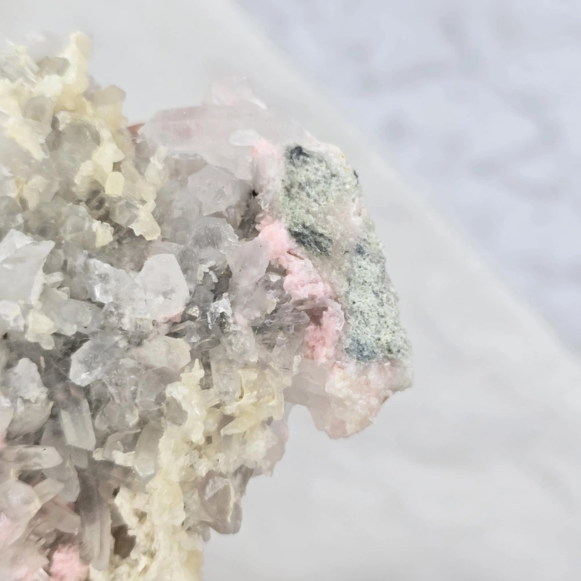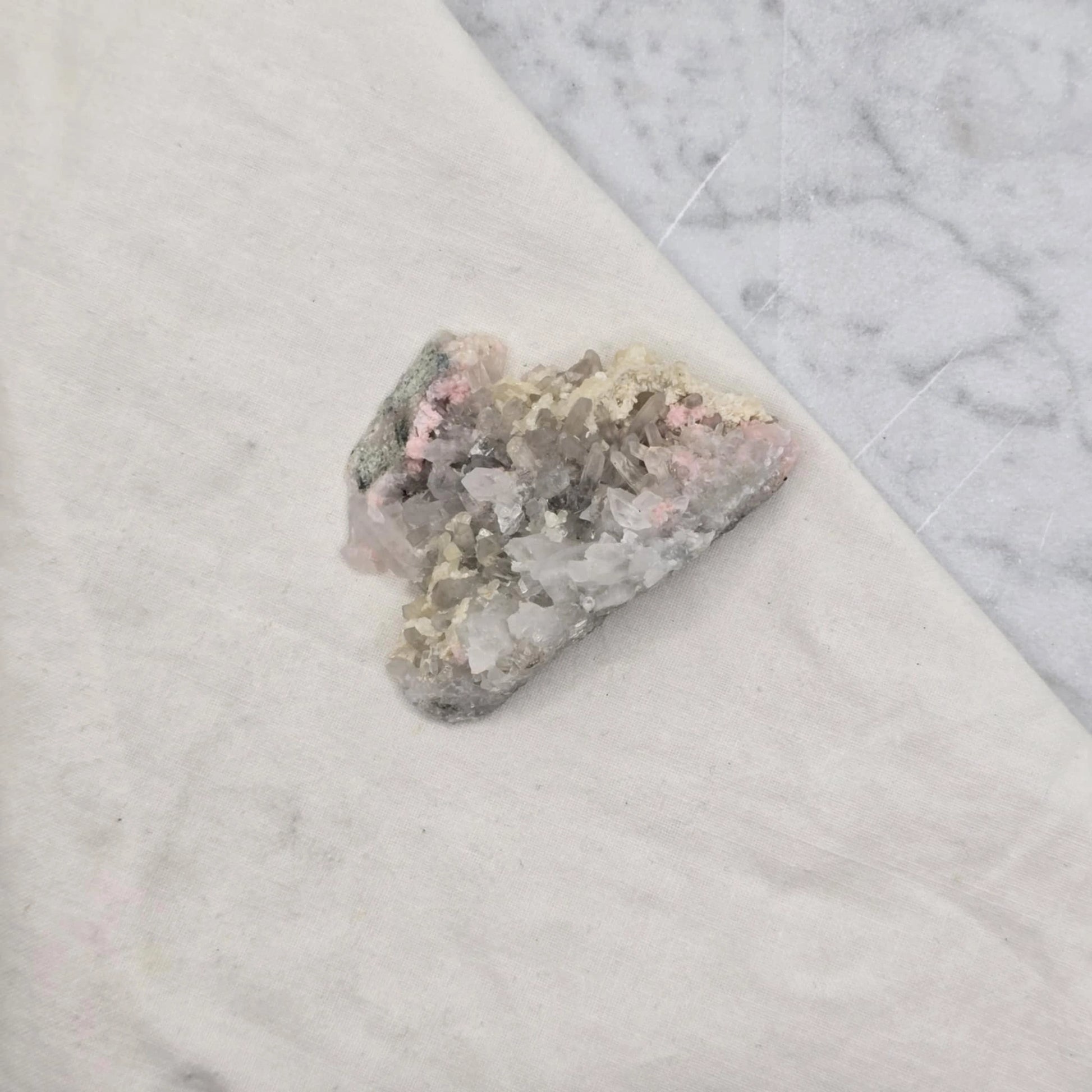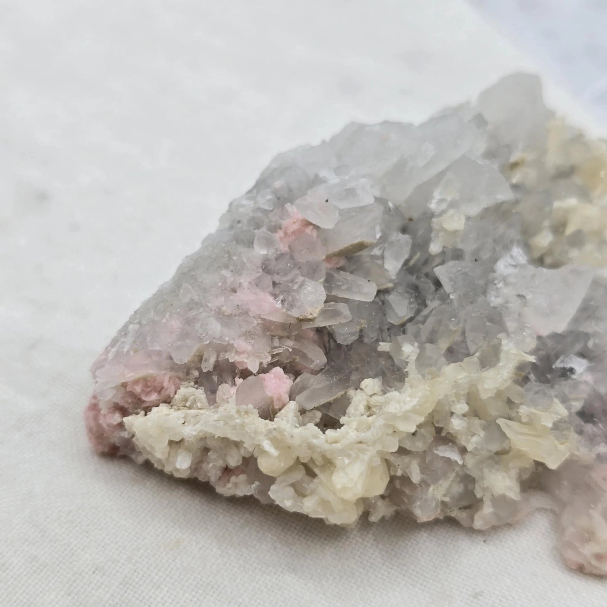 Stilbit, mineral iz skupine zeolitov, doda edinstveno teksturo z belimi, vlaknastimi kristali, ki ustvarijo kontrast z rožnato barvo rodokrozita in prosojnostjo kamene strele. Ta kombinacija mineralov prinaša moč zaščite, duhovnega čiščenja in ljubezni, kar naredi vsak kristal še bolj dragocen in iskan med zbiratelji.