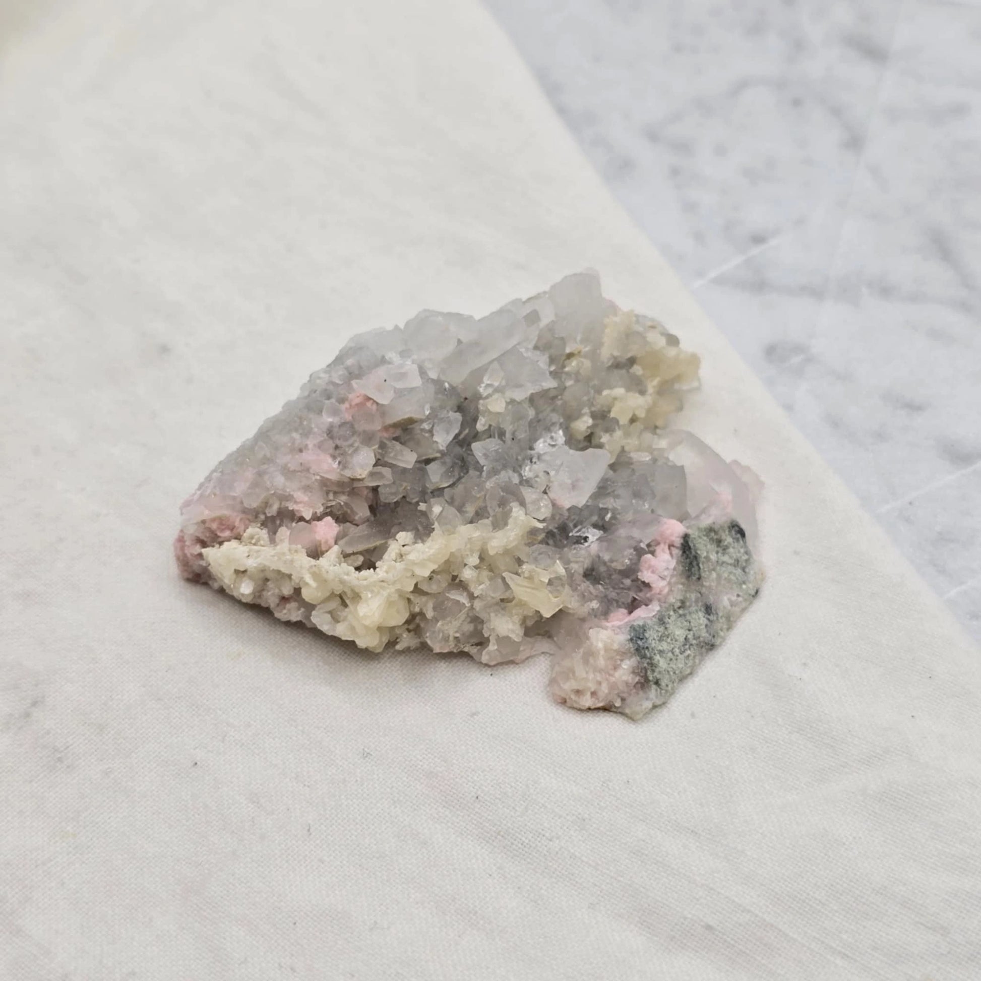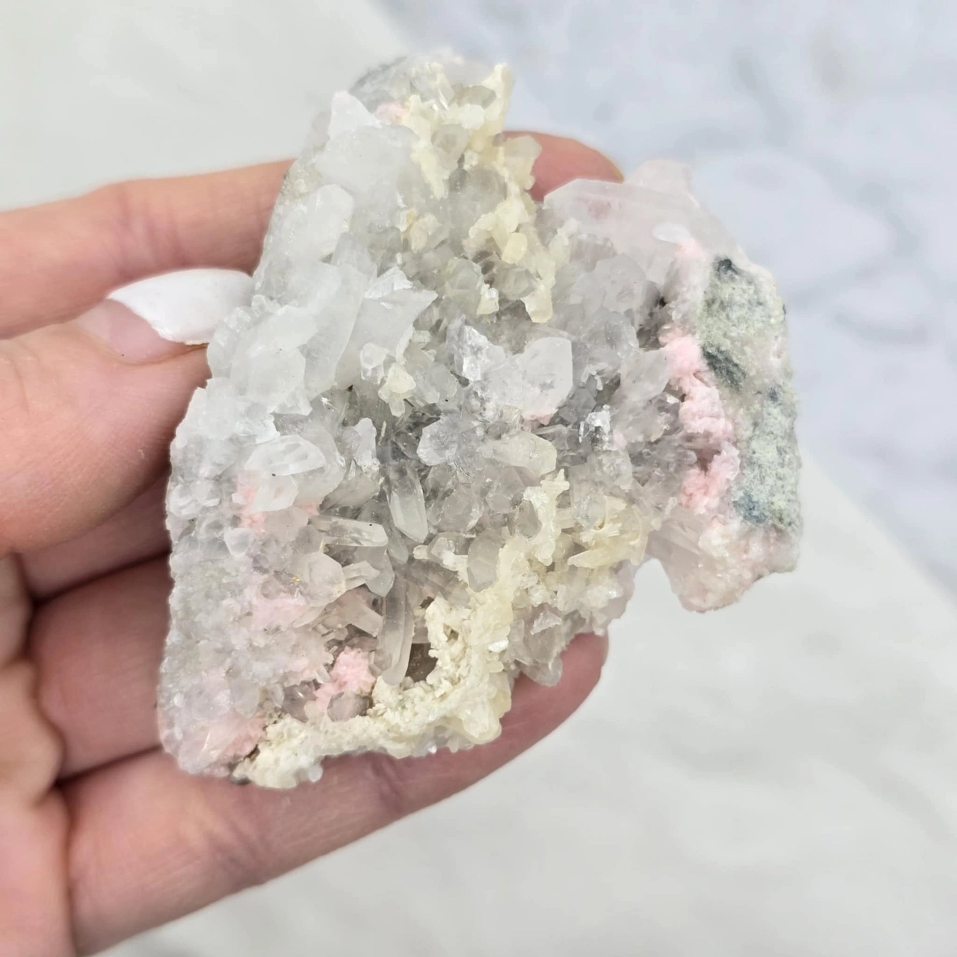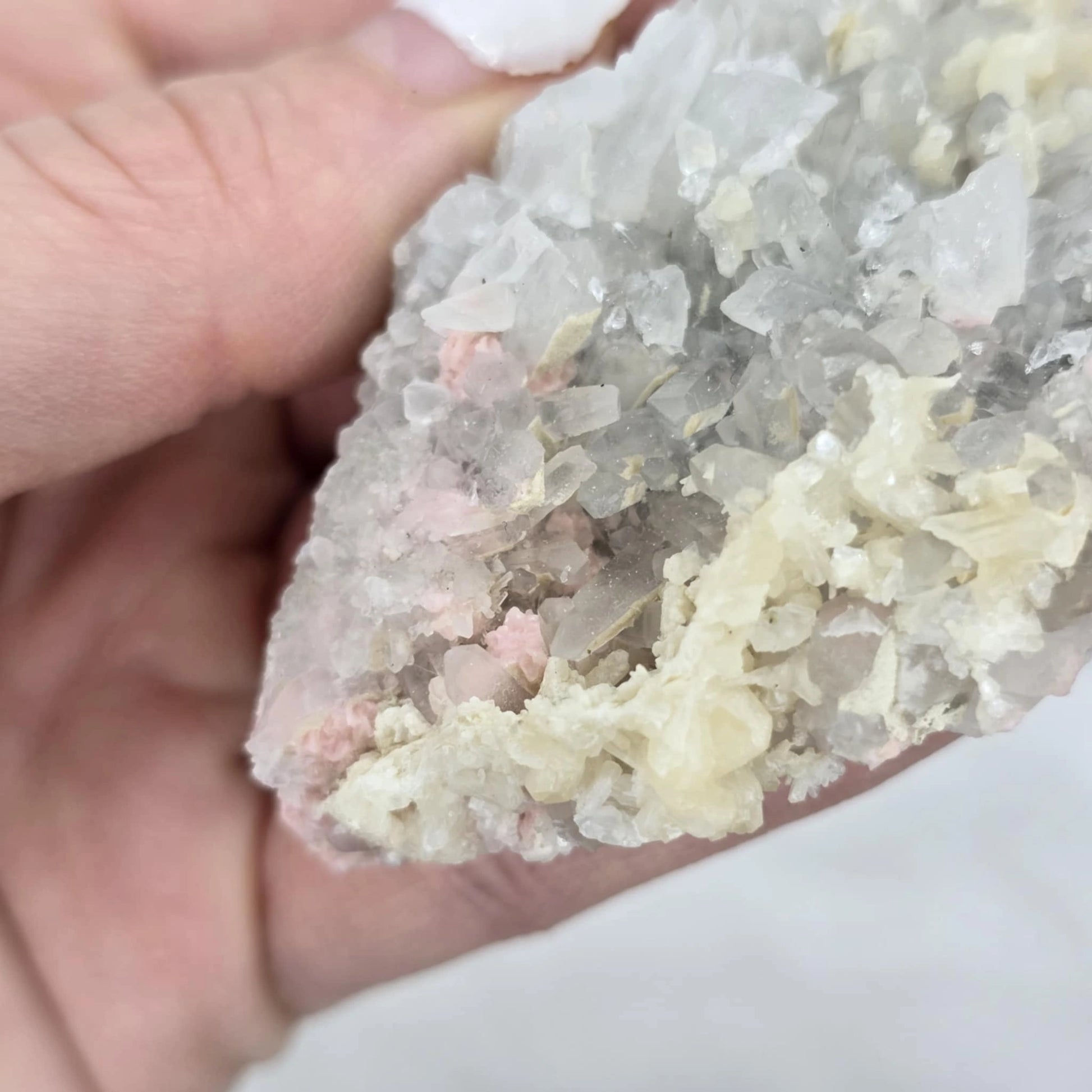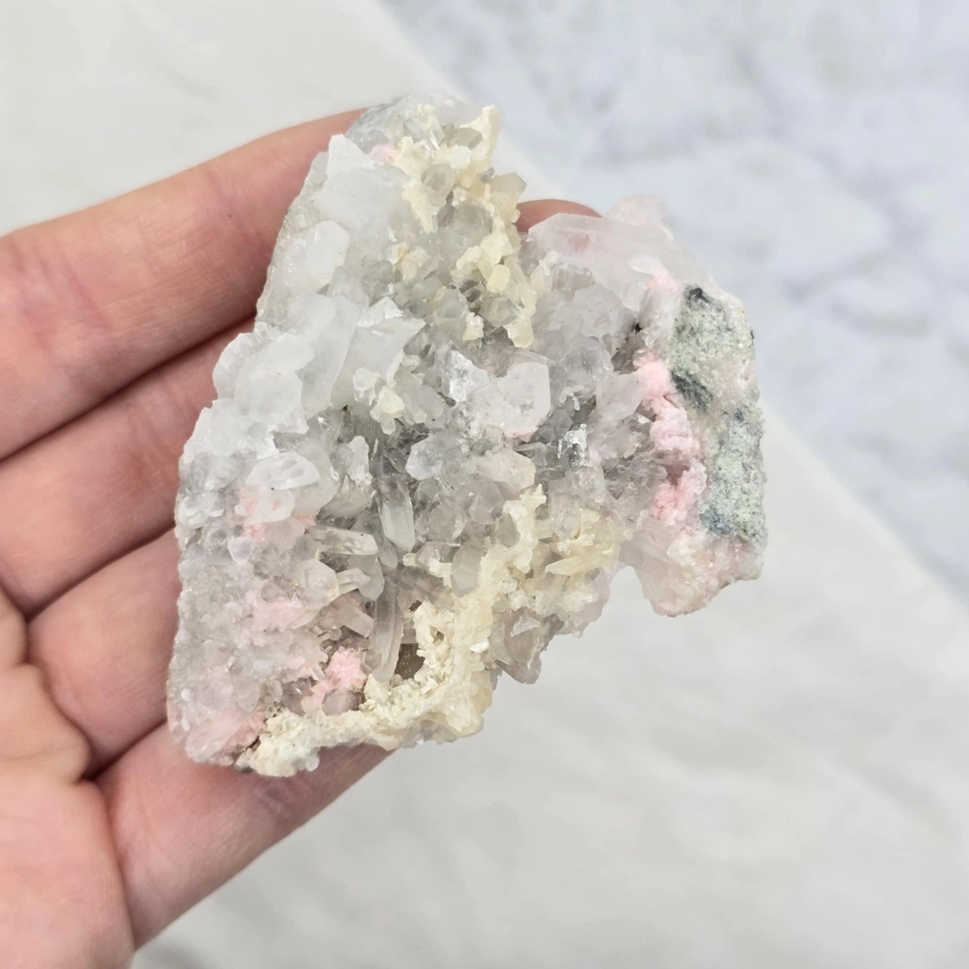 Stilbit, mineral iz skupine zeolitov, doda edinstveno teksturo z belimi, vlaknastimi kristali, ki ustvarijo kontrast z rožnato barvo rodokrozita in prosojnostjo kamene strele. Ta kombinacija mineralov prinaša moč zaščite, duhovnega čiščenja in ljubezni, kar naredi vsak kristal še bolj dragocen in iskan med zbiratelji.