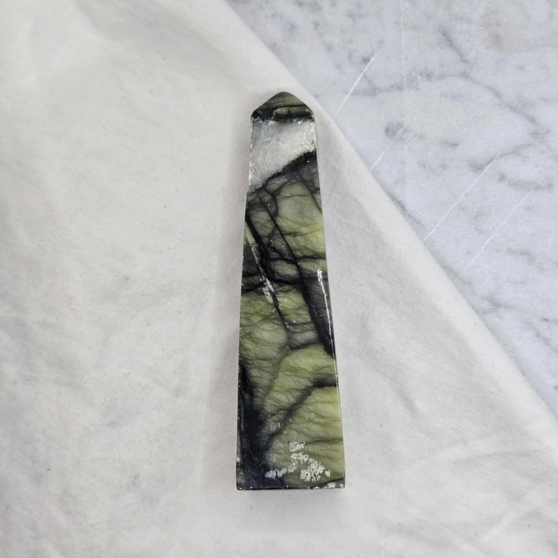 Serpentin Pajkovo Mrežo je osupljiv mineral, znan po svojih prepoznavnih vzorcih, ki spominjajo na prepleteno pajkovo mrežo. Ta unikatni kamen združuje zemeljske tone z mističnimi vzorci, kar poudarja njegovo naravno lepoto in edinstvenost. Serpentin Pajkovo Mrežo je cenjen zaradi svoje zaščitne in pomirjujoče energije, zaradi česar je idealen za vsakodnevno uporabo kot energijska podpora ali dekorativni kos.