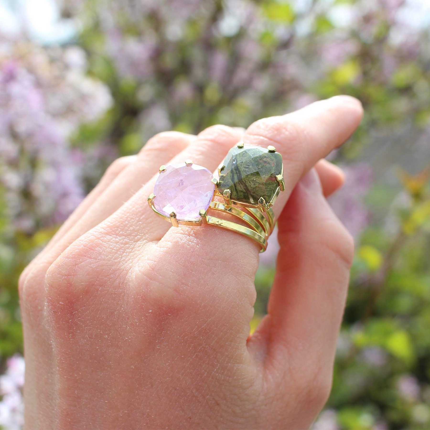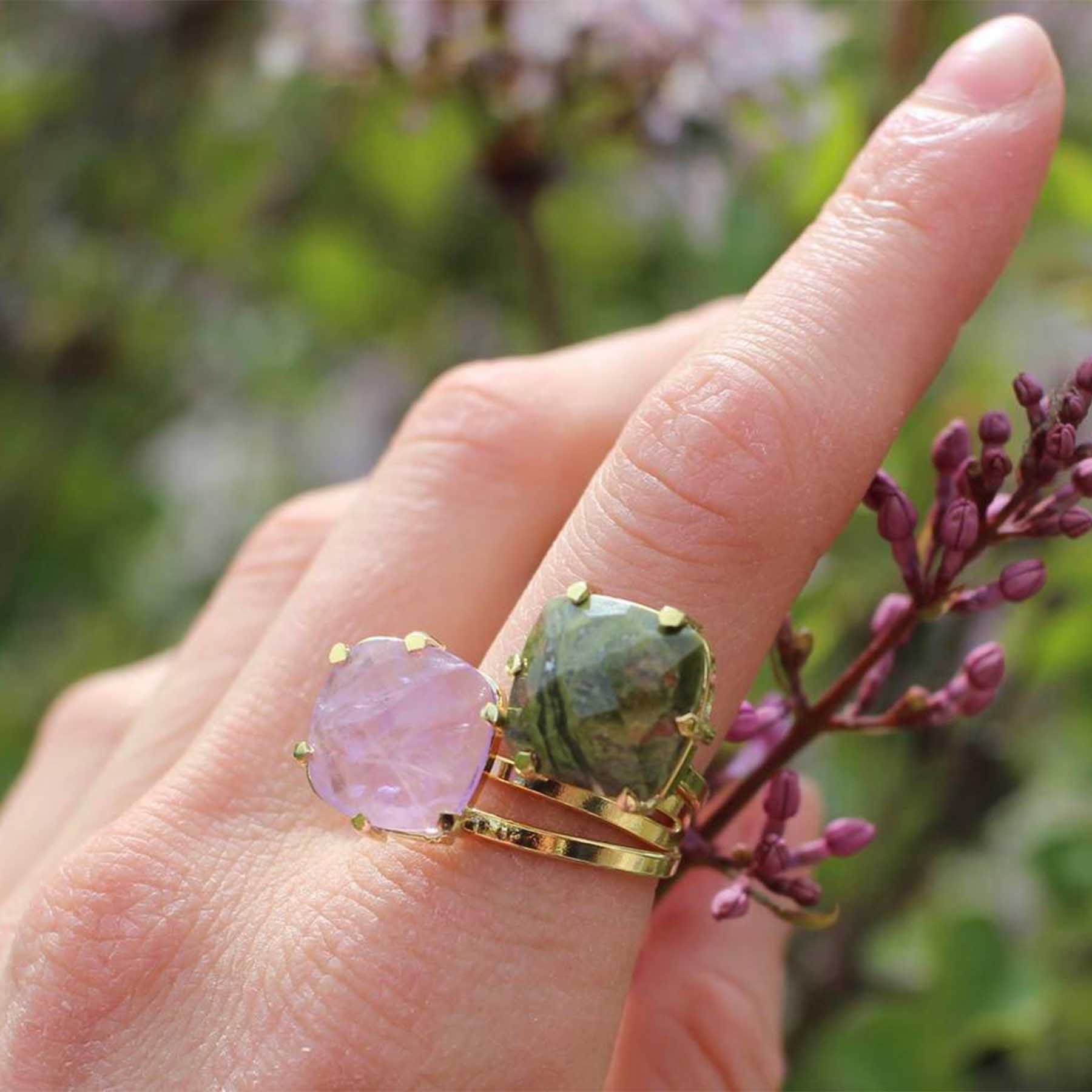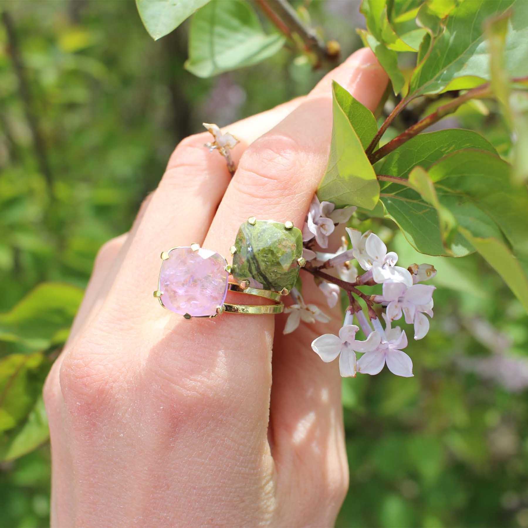 Prelepa kombinacija dveh tako različnih kristalov, pa vendar popolna harmonija le teh. Unakit z roževcem prstan je pravi kos nakita za vse, ki iščete mir, potrpežljivost in ljubezen.