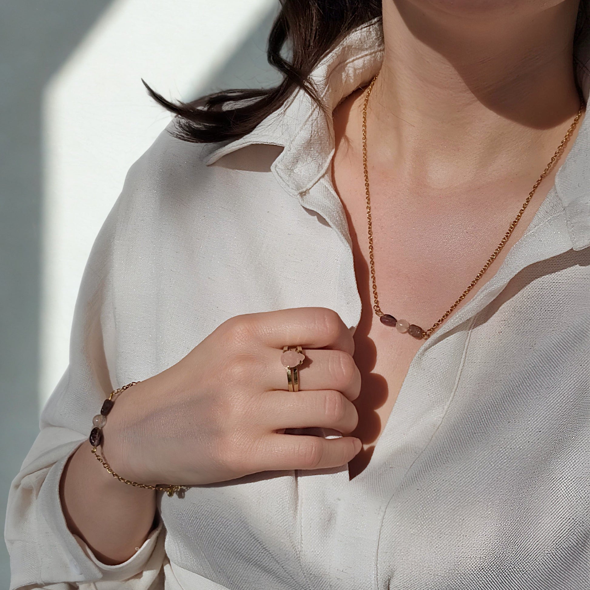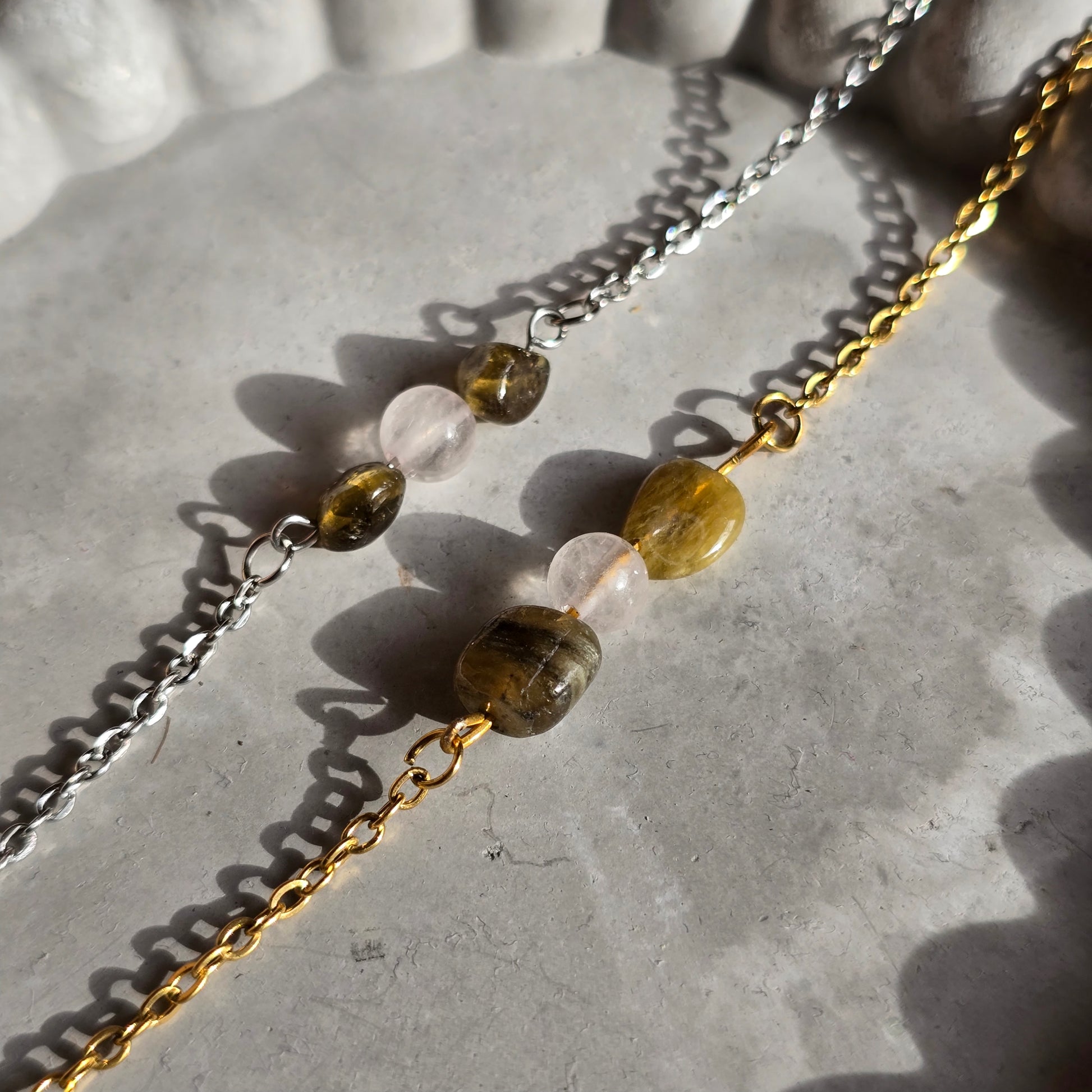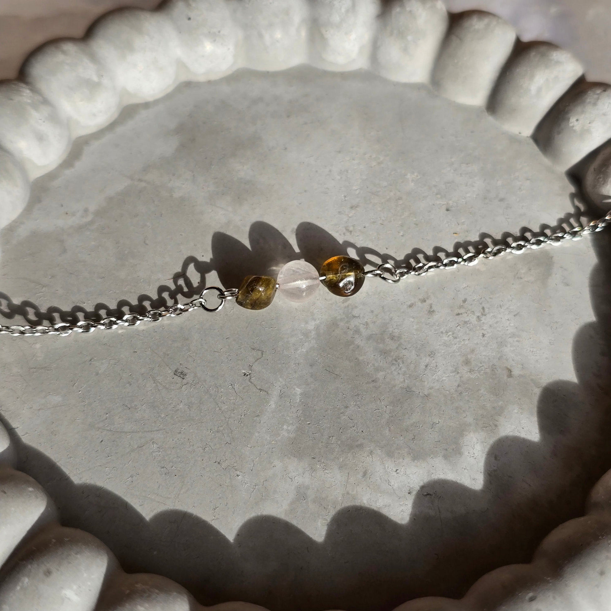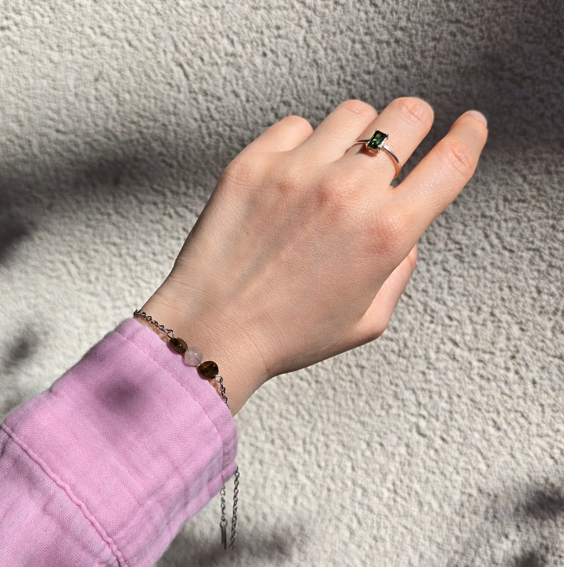 Kombinacija roževca in zelenega turmalina združuje nežno energijo ljubezni z energijo rasti in ravnovesja. Ta harmonična povezava simbolizira odprto srce, notranji mir ter povezanost z naravo in samim seboj.