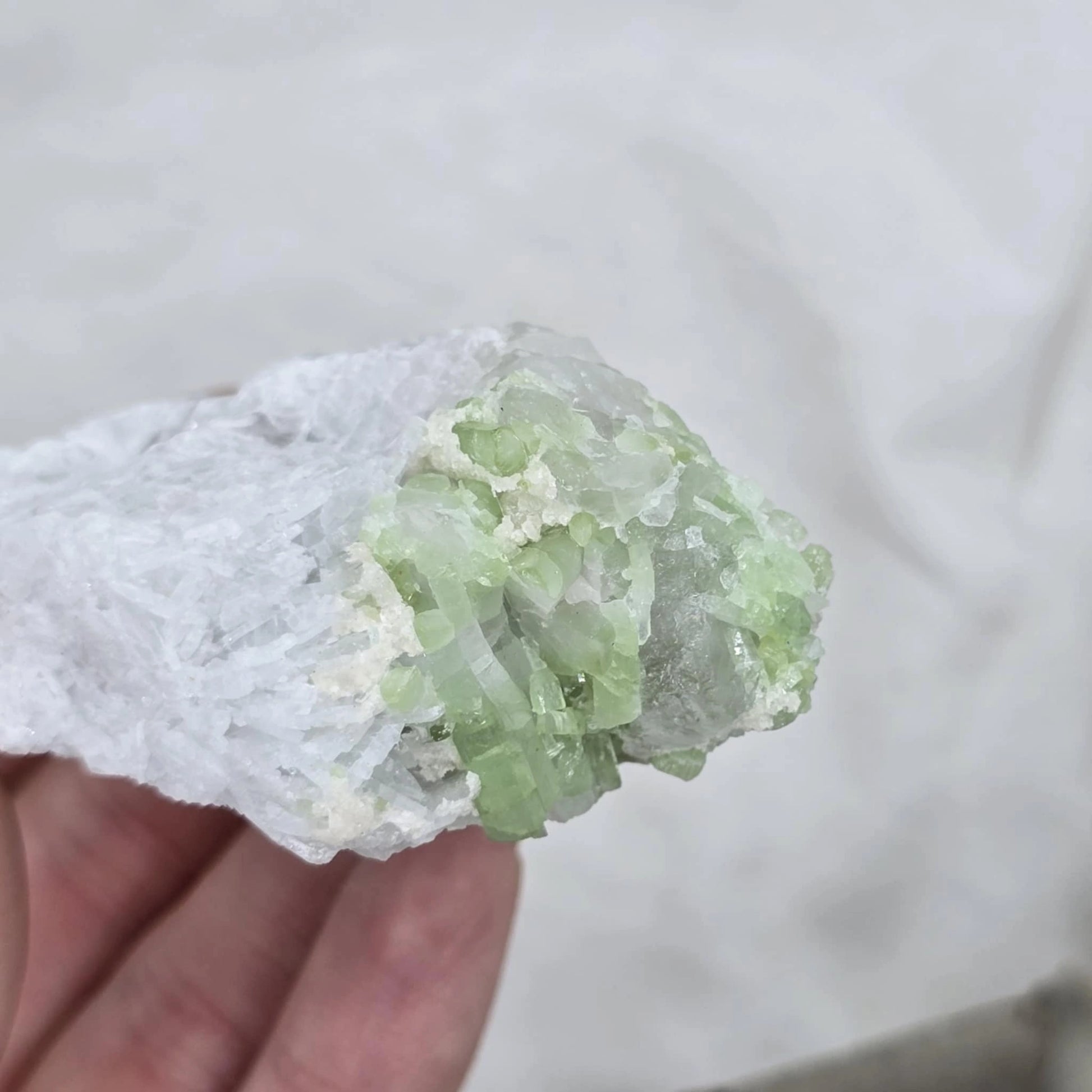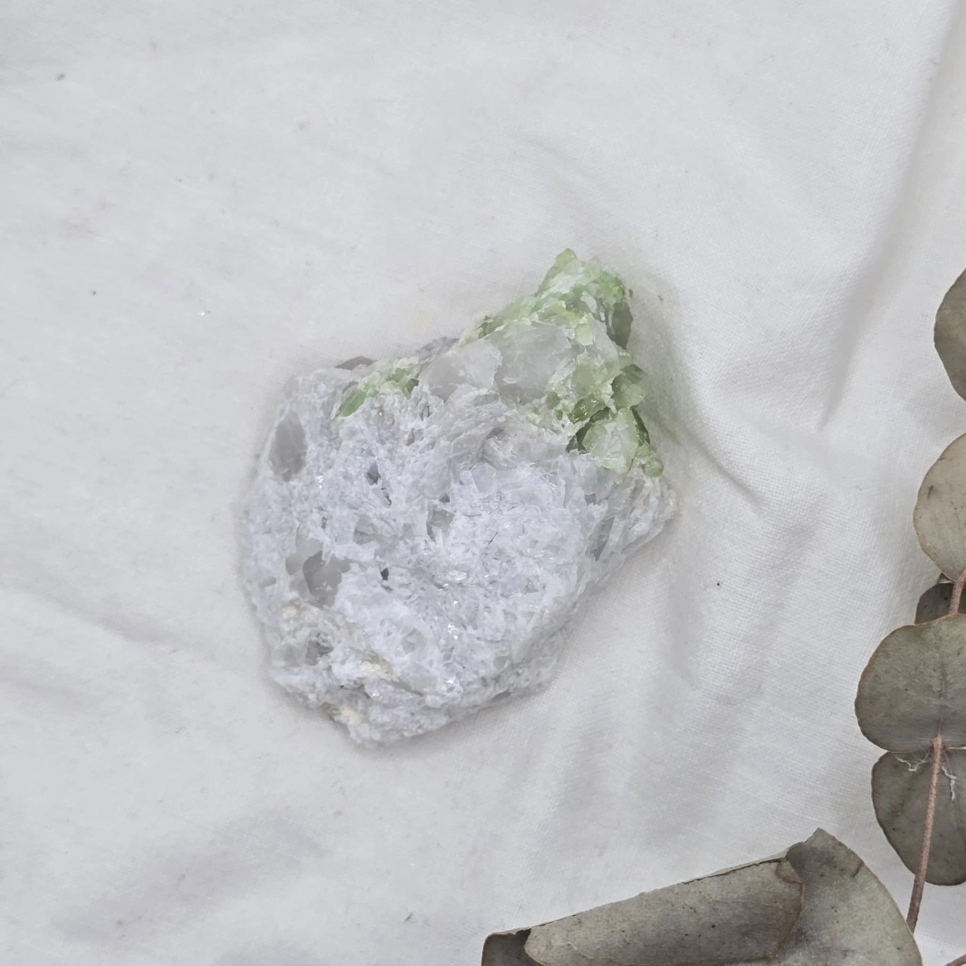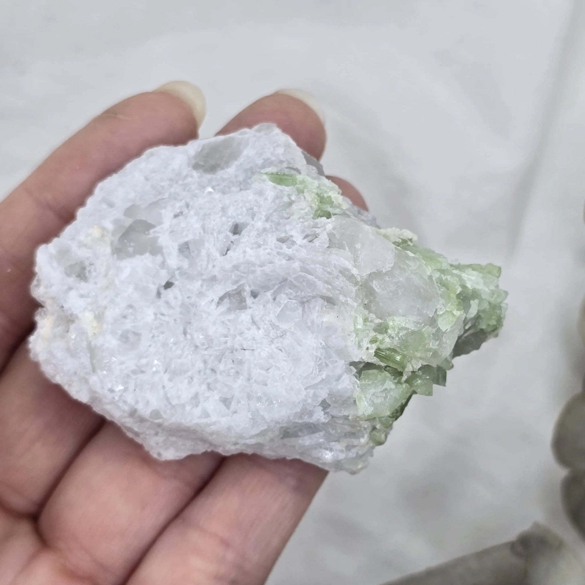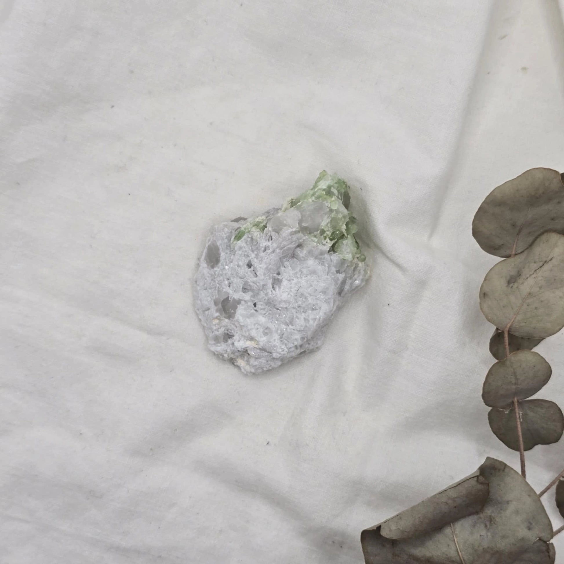 Zeleni turmalin, v kombinaciji s kvarcom, lepidolitom in albitom, predstavlja edinstveno in harmonično združitev moči naravnih mineralov. Ta osupljiva kombinacija združuje energijske lastnosti vseh štirih mineralov, kar ustvarja izjemno močan kristal. Zeleni turmalin je znan po svojih pomirjujočih in zaščitnih lastnostih, medtem ko kvarc povečuje energetsko pretočnost, lepidolit prinaša čustveno ravnovesje, albit pa spodbuja notranjo moč in odpornost.