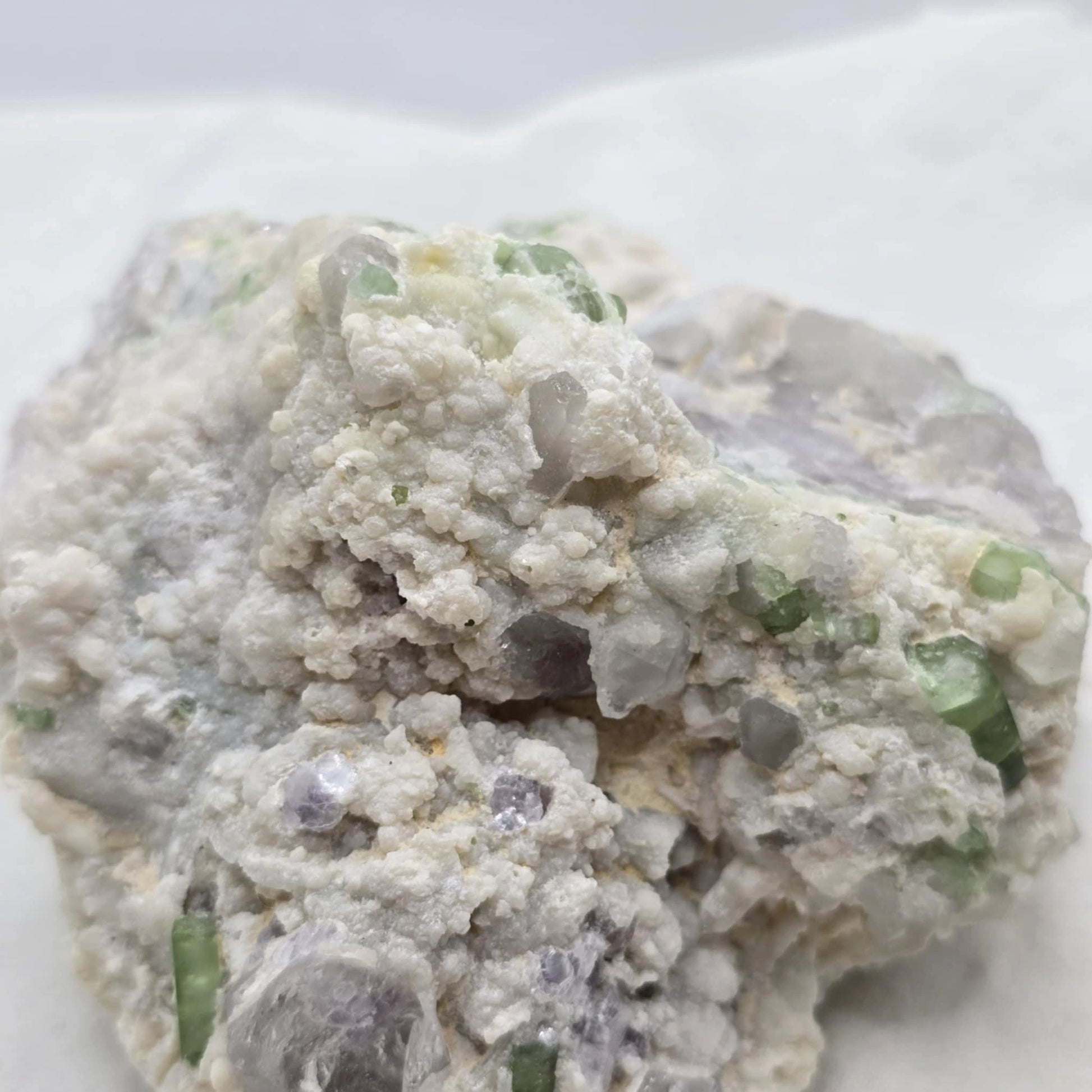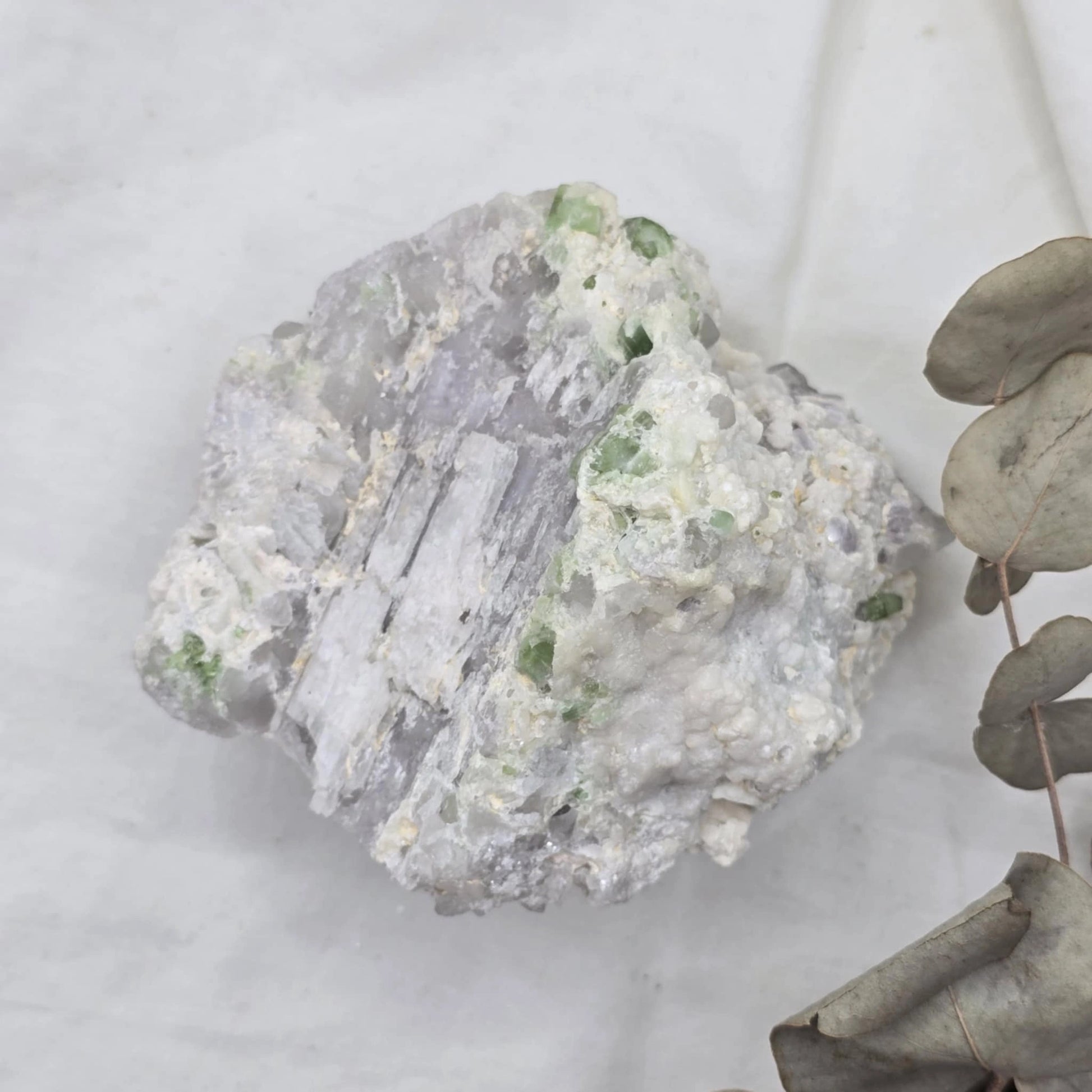 Zeleni turmalin, v kombinaciji s kvarcom, lepidolitom in albitom, predstavlja edinstveno in harmonično združitev moči naravnih mineralov. Ta osupljiva kombinacija združuje energijske lastnosti vseh štirih mineralov, kar ustvarja izjemno močan kristal. Zeleni turmalin je znan po svojih pomirjujočih in zaščitnih lastnostih, medtem ko kvarc povečuje energetsko pretočnost, lepidolit prinaša čustveno ravnovesje, albit pa spodbuja notranjo moč in odpornost.