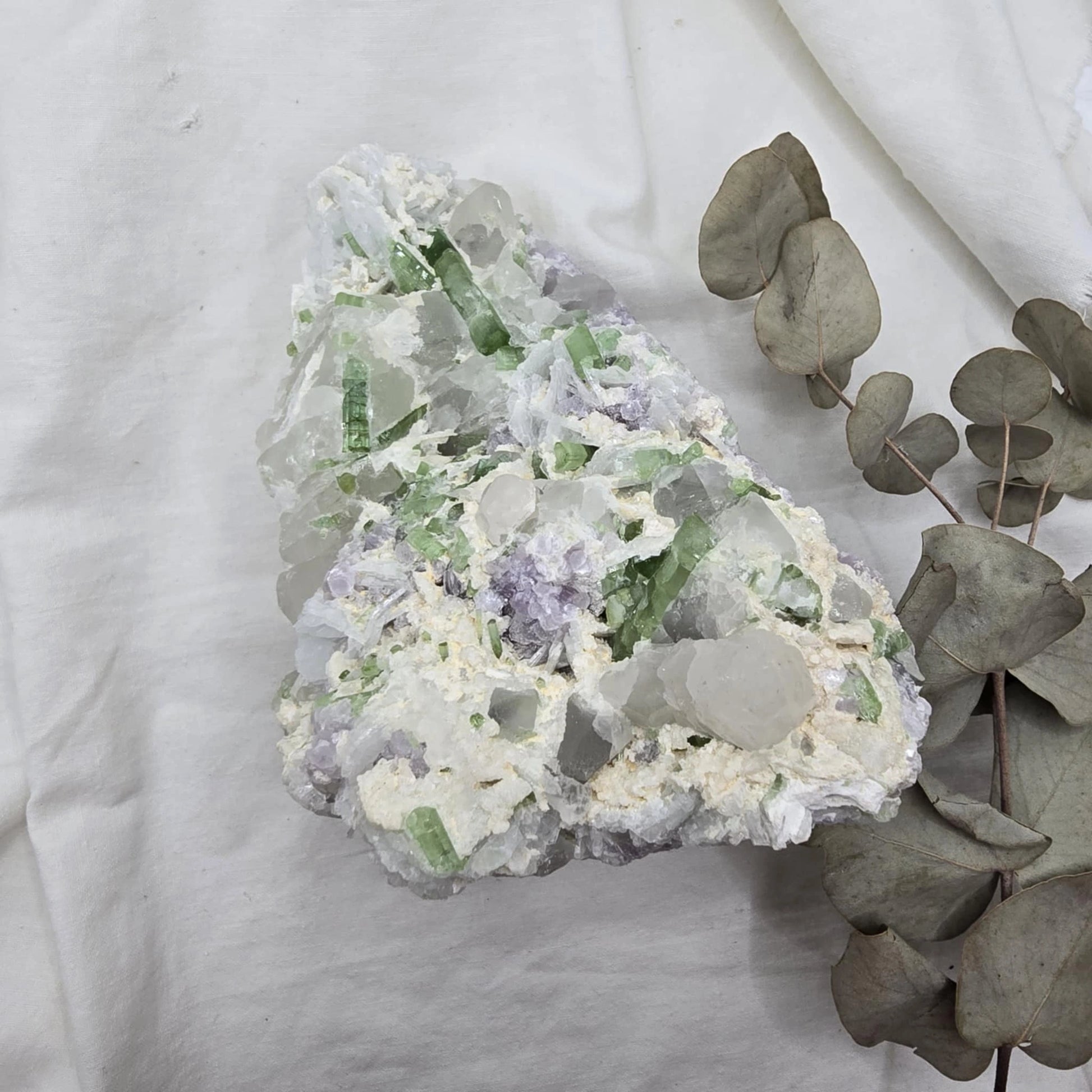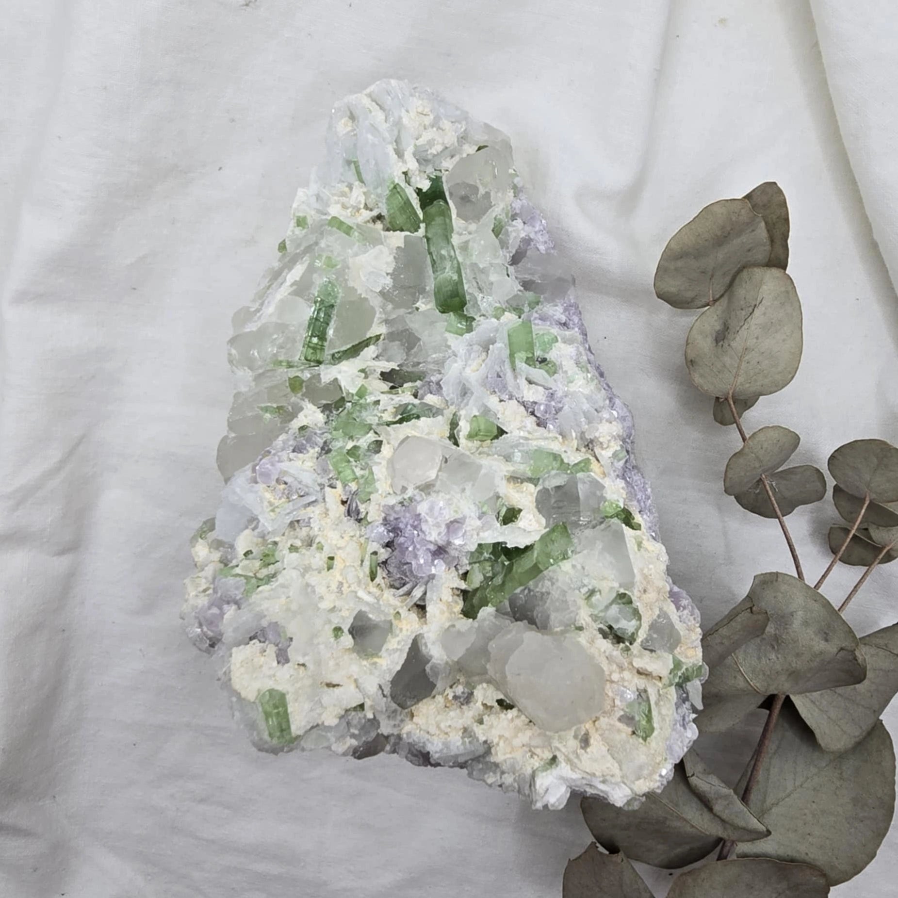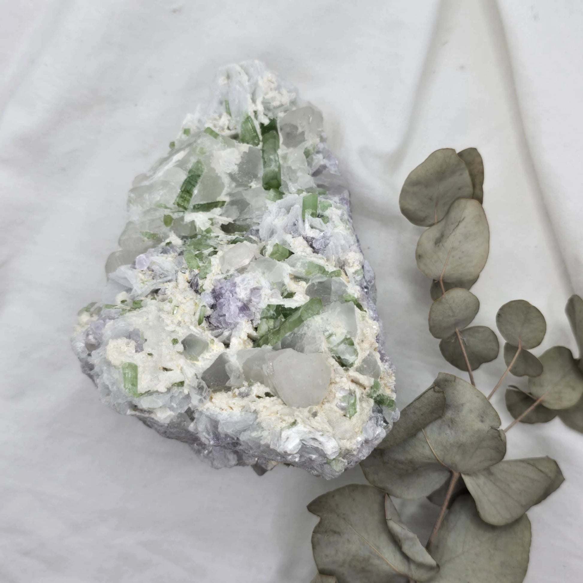 Zeleni turmalin, v kombinaciji s kvarcom, lepidolitom in albitom, predstavlja edinstveno in harmonično združitev moči naravnih mineralov. Ta osupljiva kombinacija združuje energijske lastnosti vseh štirih mineralov, kar ustvarja izjemno močan kristal. Zeleni turmalin je znan po svojih pomirjujočih in zaščitnih lastnostih, medtem ko kvarc povečuje energetsko pretočnost, lepidolit prinaša čustveno ravnovesje, albit pa spodbuja notranjo moč in odpornost.
