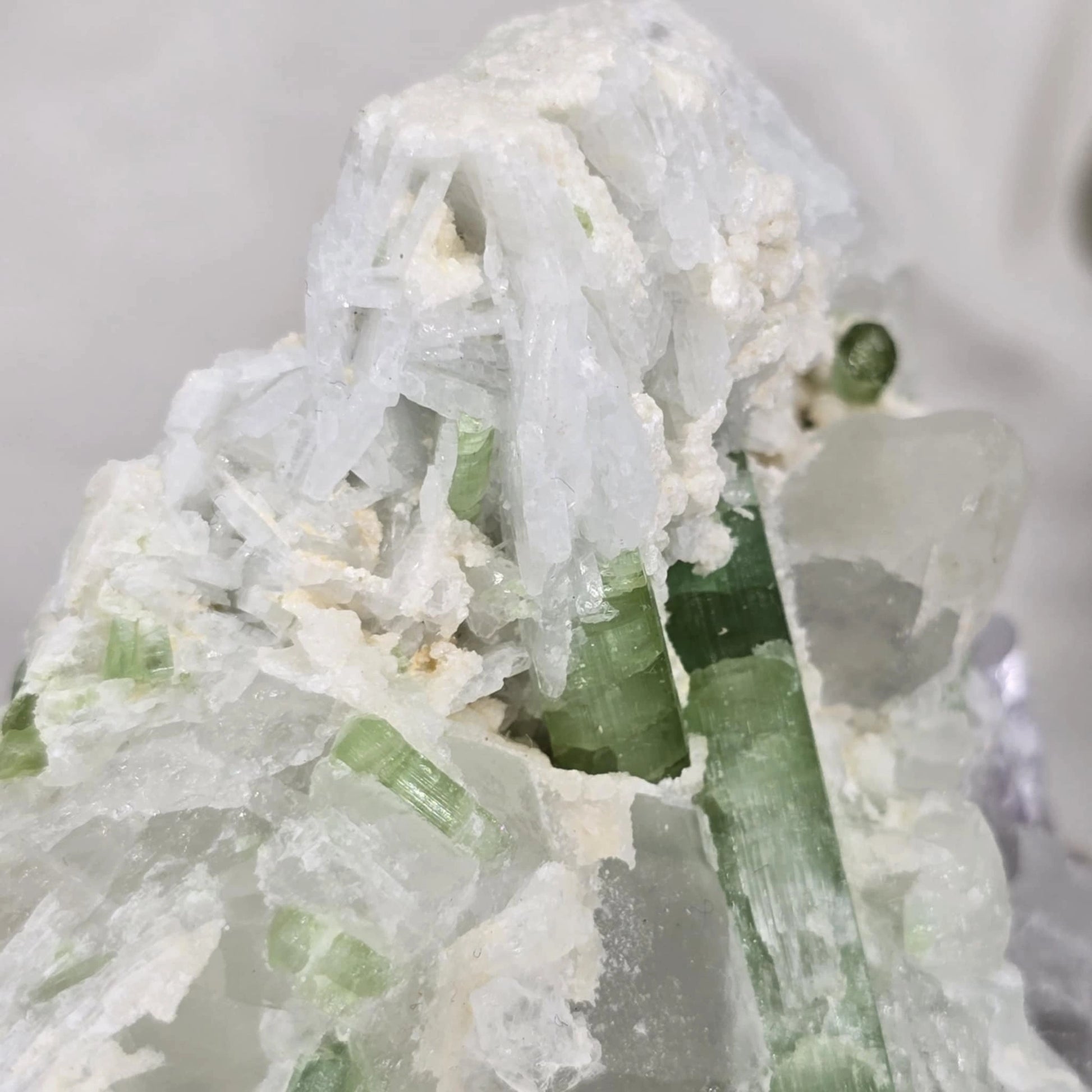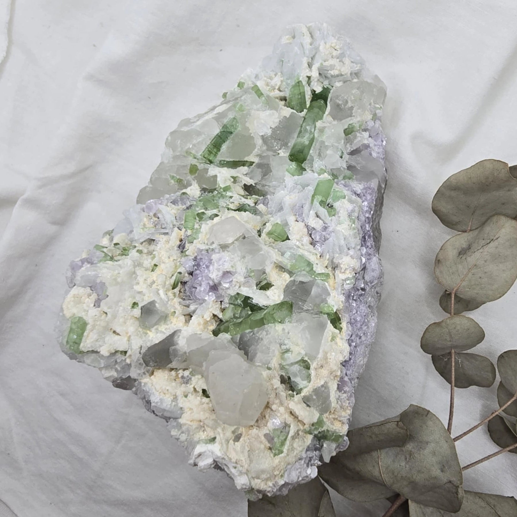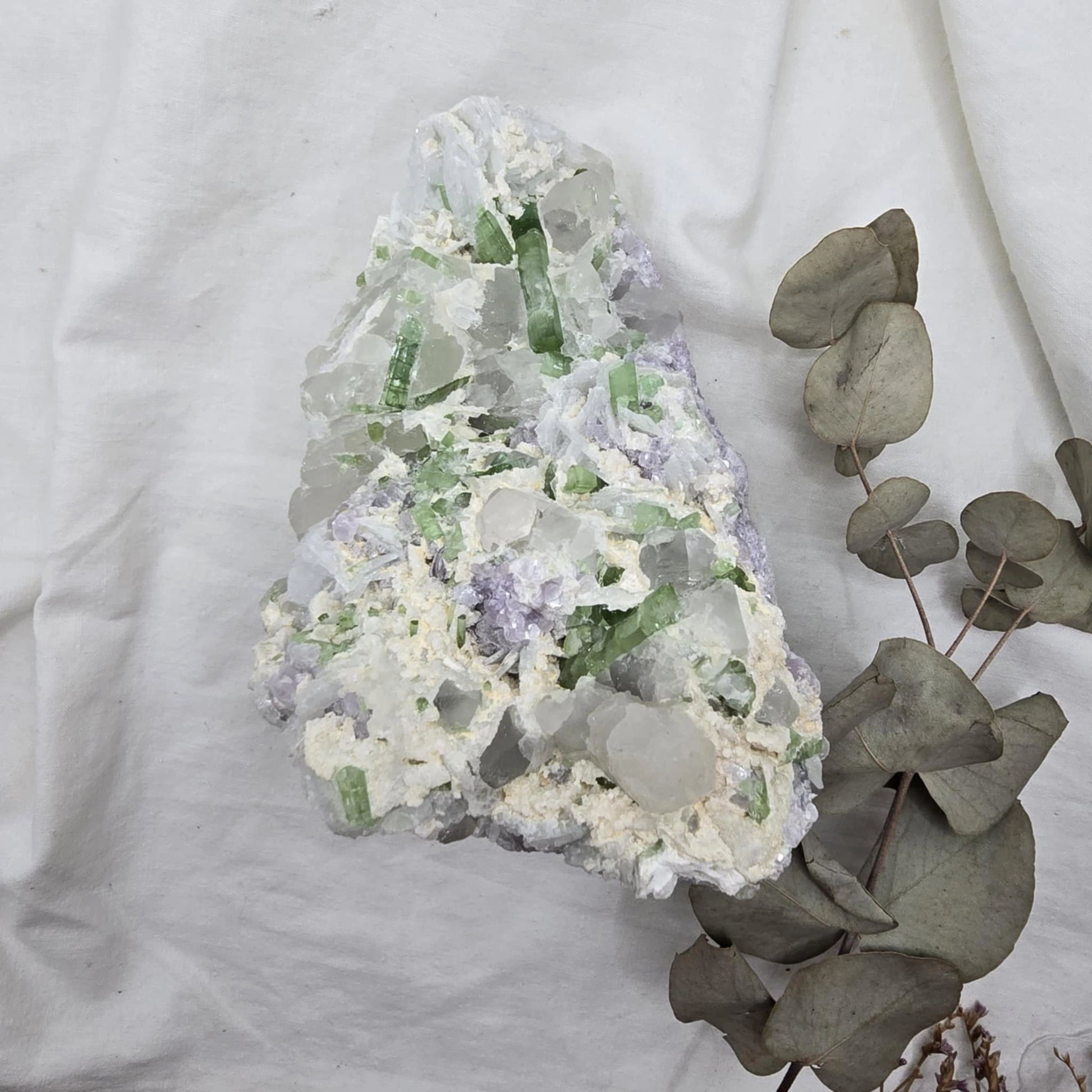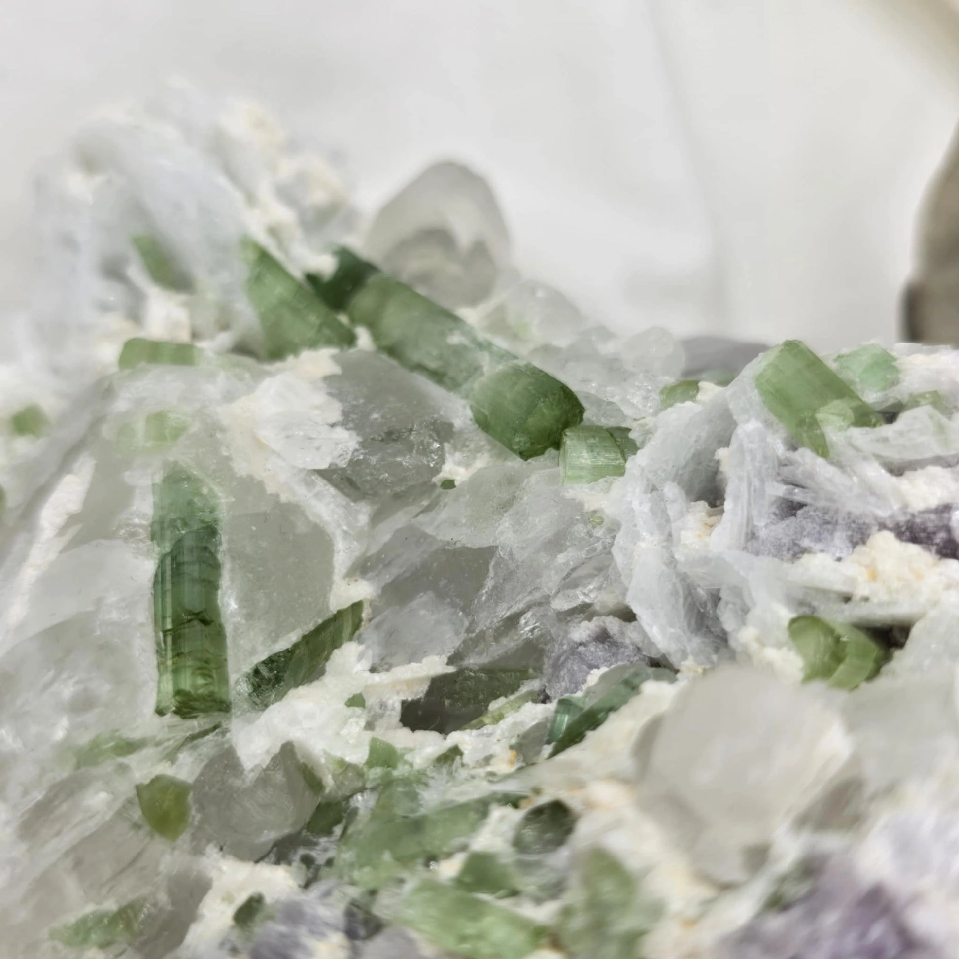 Zeleni turmalin, v kombinaciji s kvarcom, lepidolitom in albitom, predstavlja edinstveno in harmonično združitev moči naravnih mineralov. Ta osupljiva kombinacija združuje energijske lastnosti vseh štirih mineralov, kar ustvarja izjemno močan kristal. Zeleni turmalin je znan po svojih pomirjujočih in zaščitnih lastnostih, medtem ko kvarc povečuje energetsko pretočnost, lepidolit prinaša čustveno ravnovesje, albit pa spodbuja notranjo moč in odpornost.
